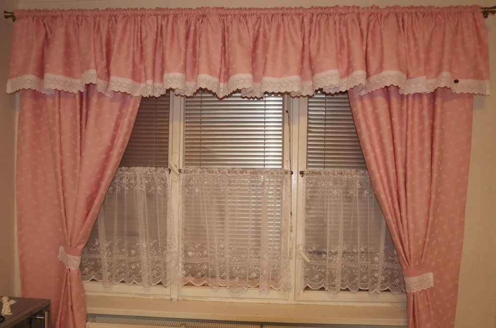 - Závěsy do chalupy růžová kytička s vyšívanou krajkou