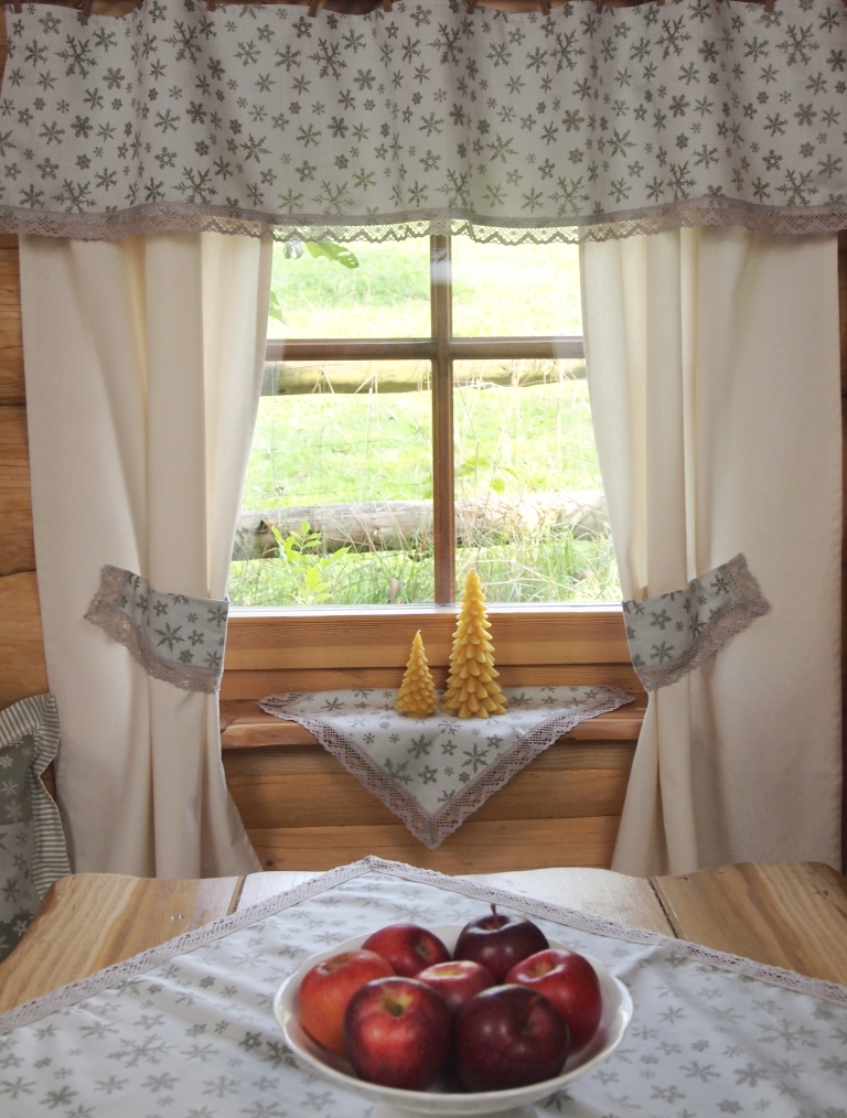 Vánoční závěsy v přírodní režné barvě, ozdobeny úchytem s krajkou. Kanýr s vánočním vzorem sněhových vloček je zdoben paličkovanou krajkou.